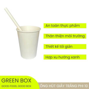 Tại Chiếc Hộp Xanh, chúng tôi cung cấp ly giấy trắng 270ml – 650ml, ống hút giấy phi 6 – 12, và nắp giấy/nắp nhựa trong đạt chuẩn quốc tế (HACCP, BRC, FDA, EU).